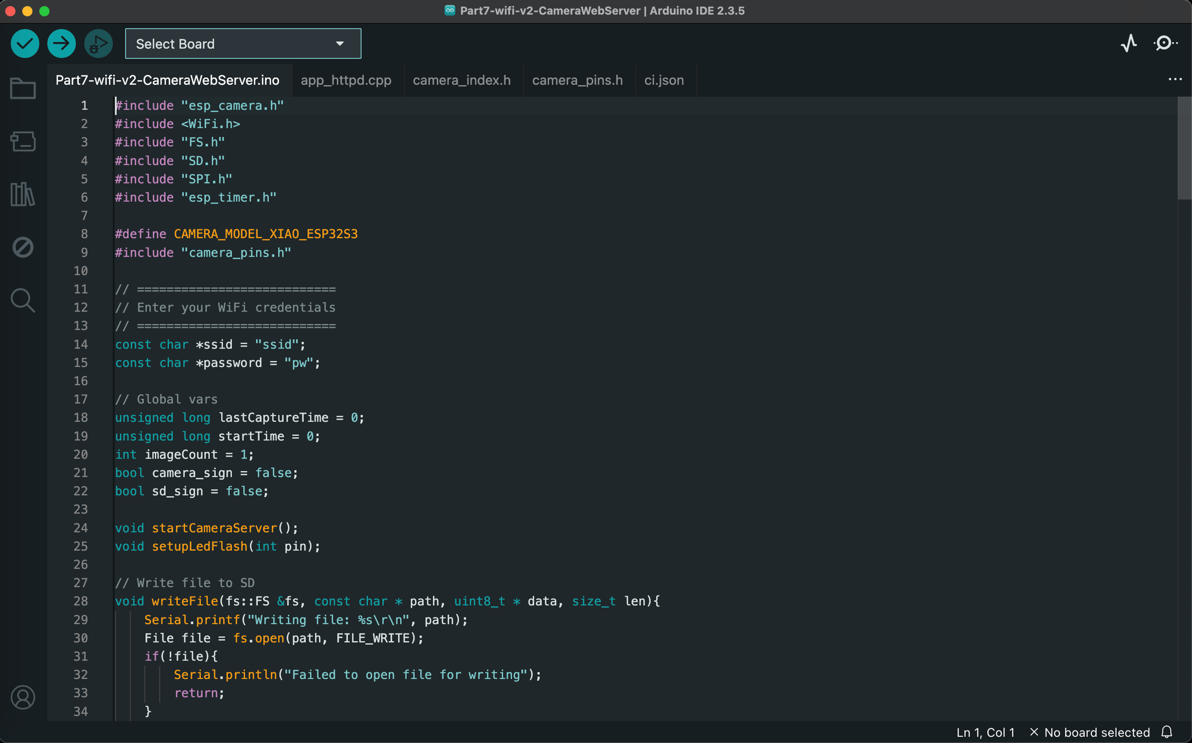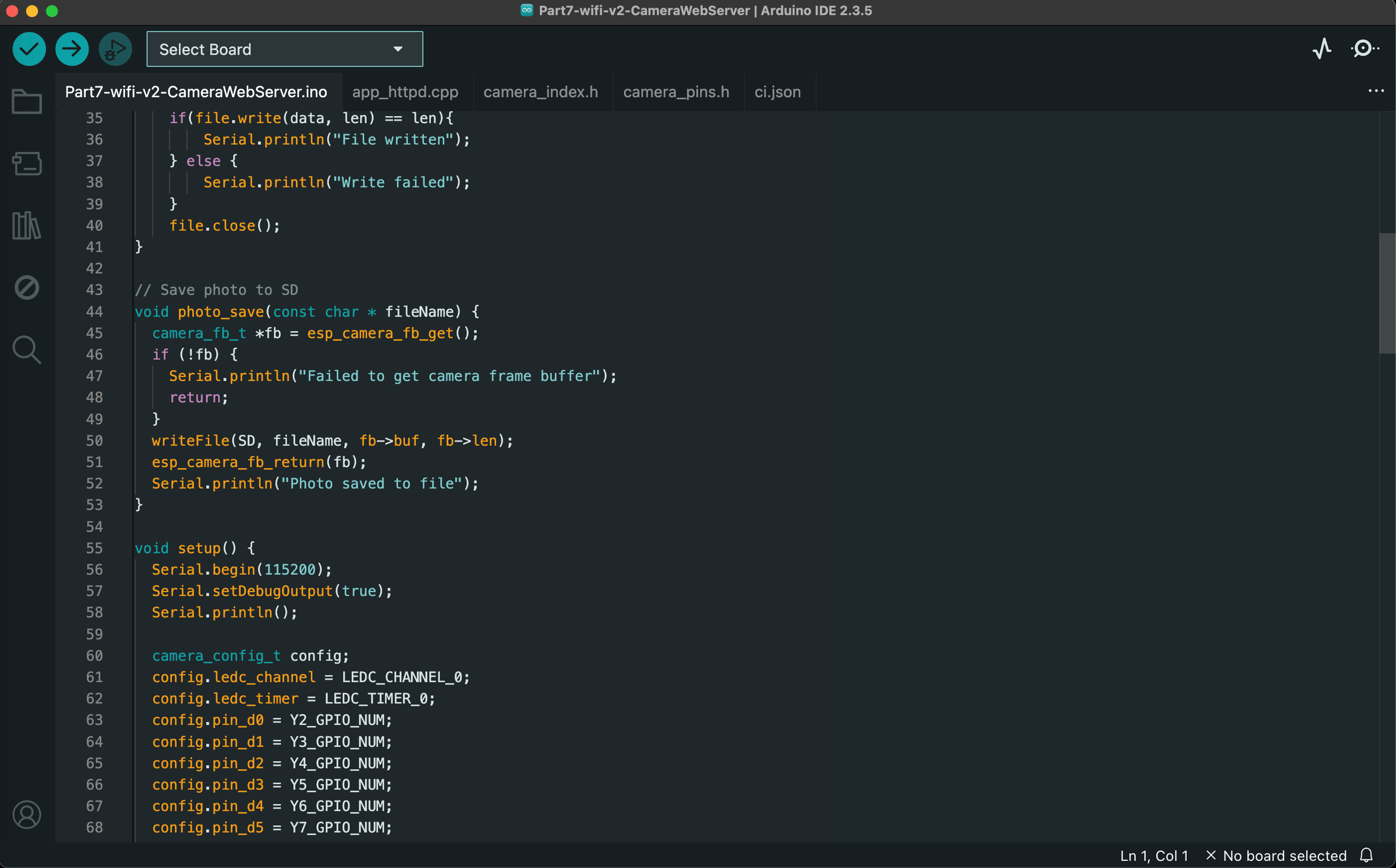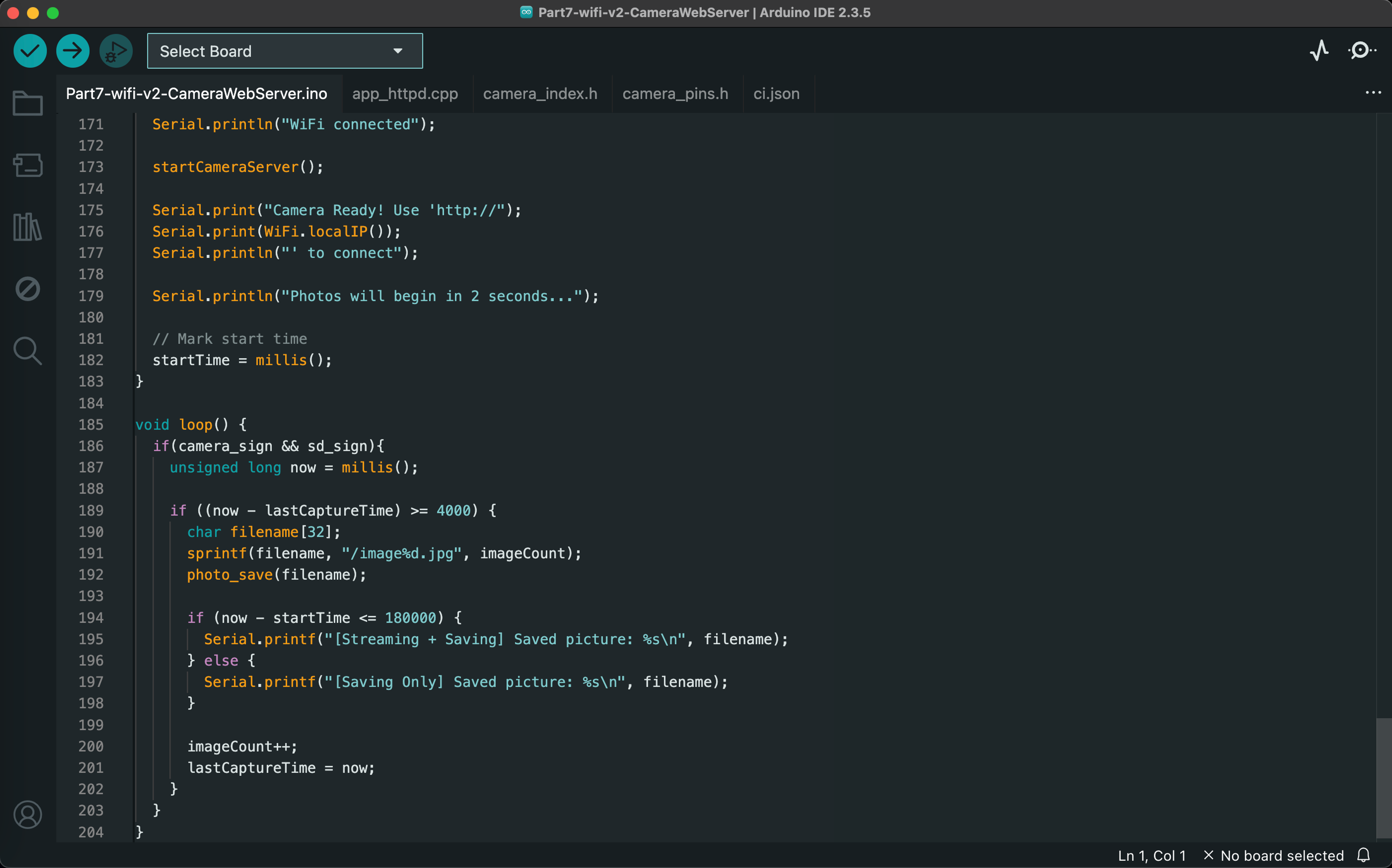 This project streams live video over WiFi and simultaneously stores static images on the SD card. I was not able to use the code provided in class, so I combined the camera timer functionality from the code provided in class with an example Arduino sketch (Examples/ESP32/Camera/CameraWebServer).