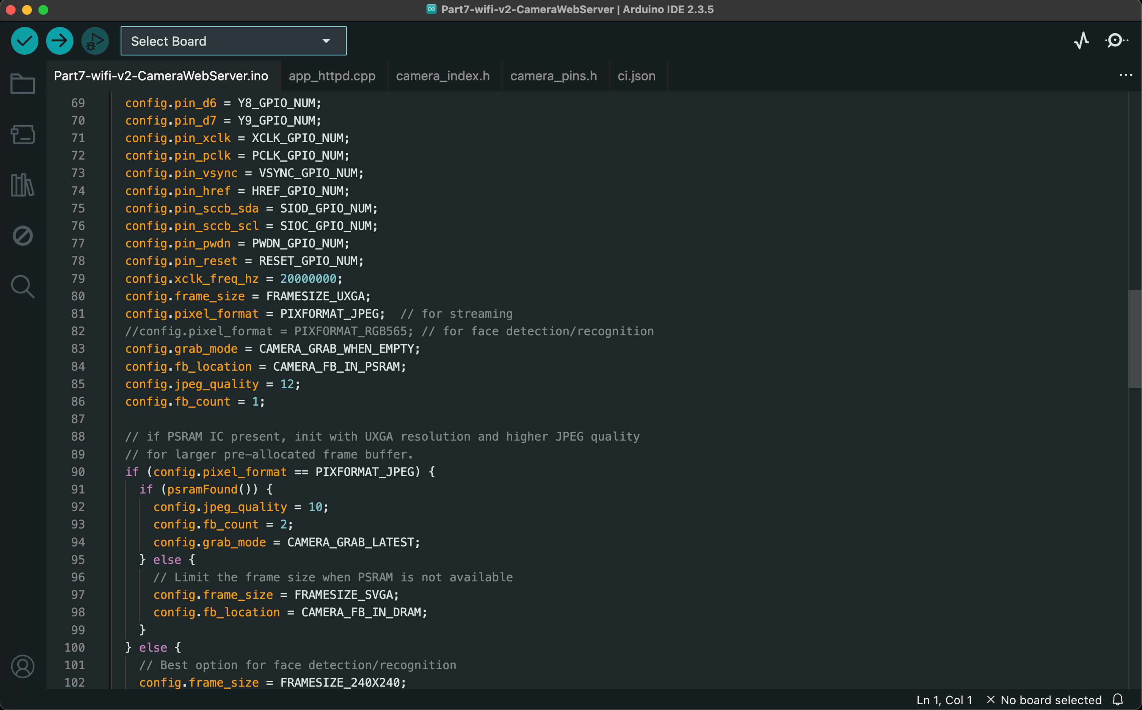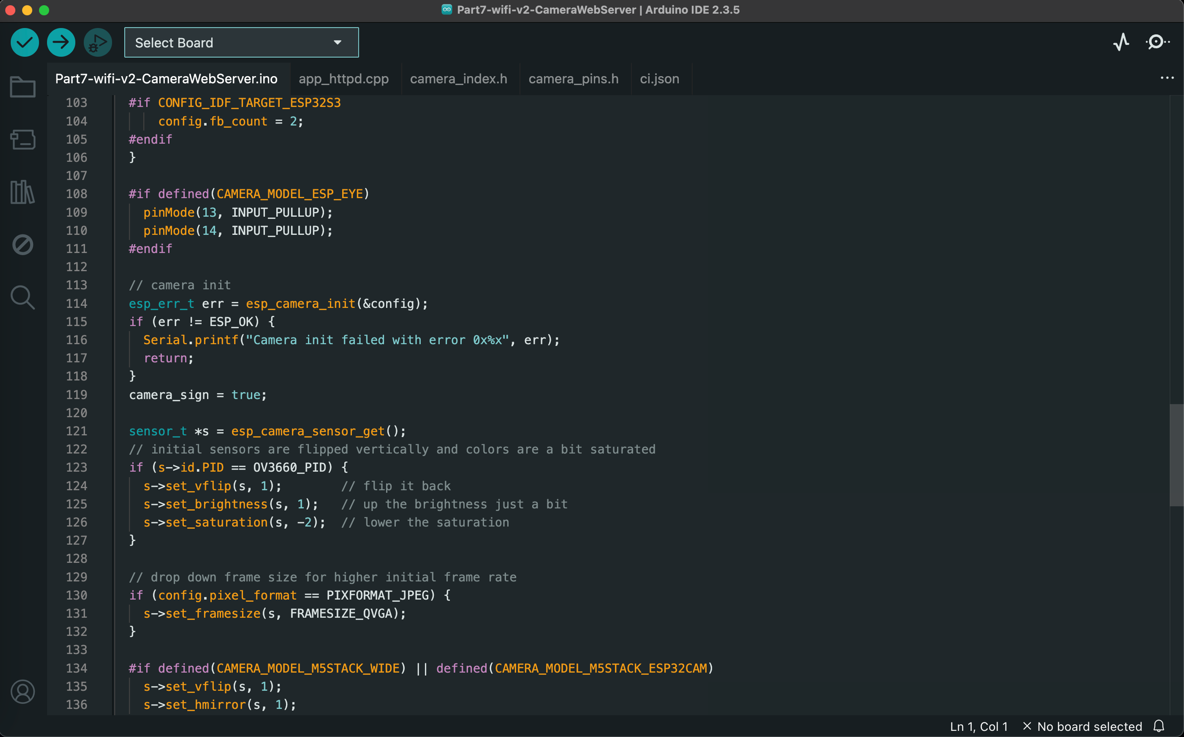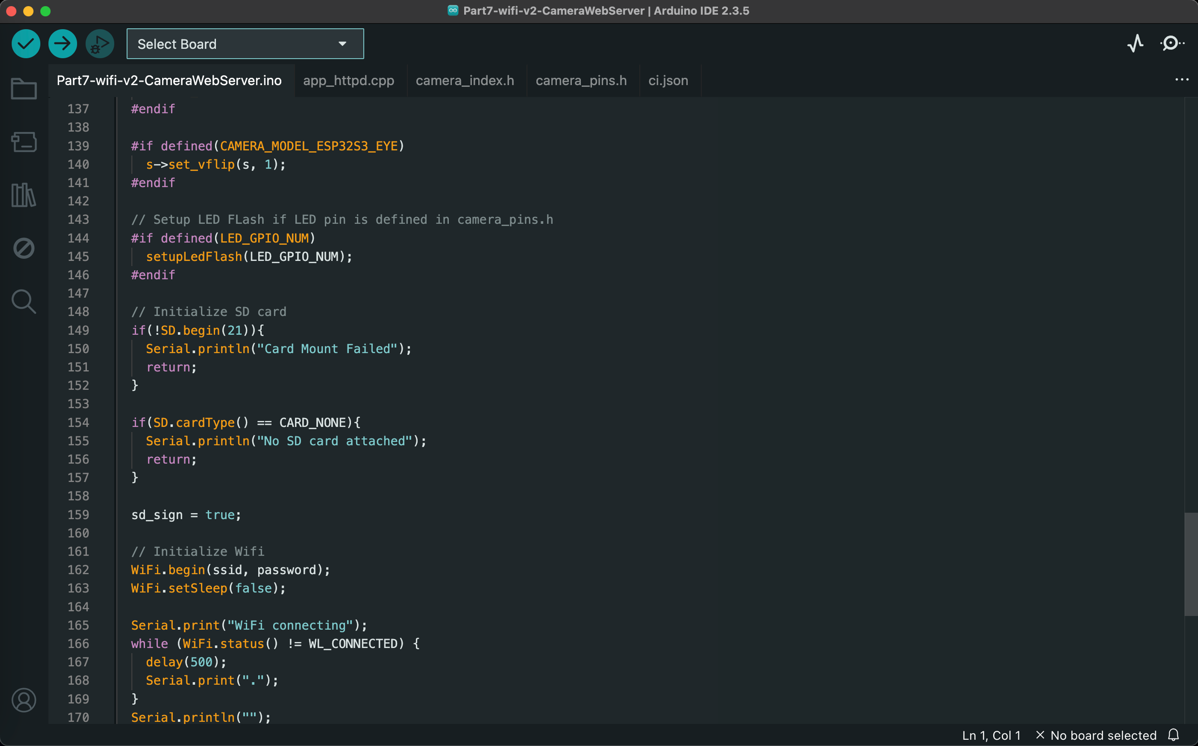 This project streams live video over WiFi and simultaneously stores static images on the SD card. I was not able to use the code provided in class, so I combined the camera timer functionality from the code provided in class with an example Arduino sketch (Examples/ESP32/Camera/CameraWebServer).