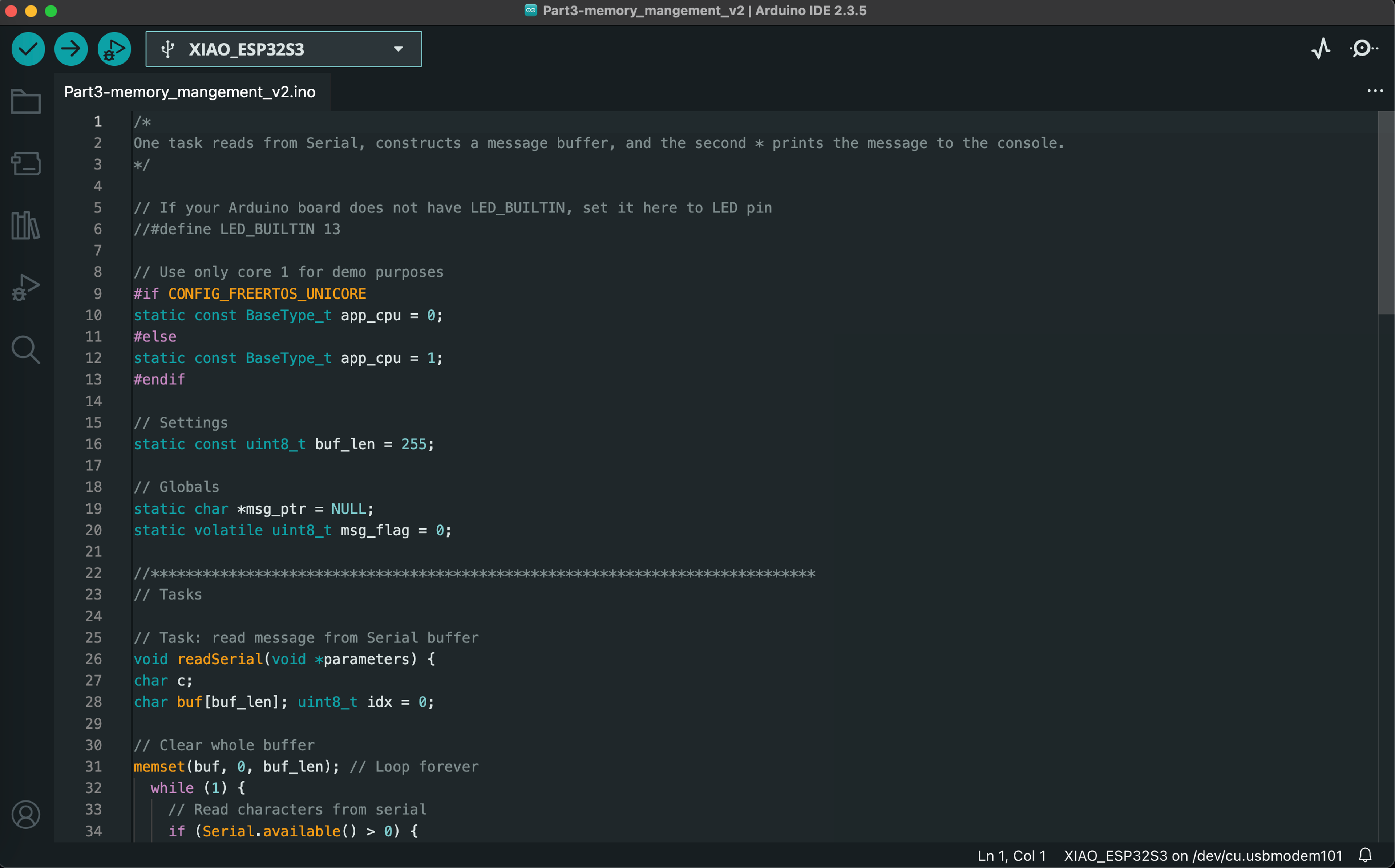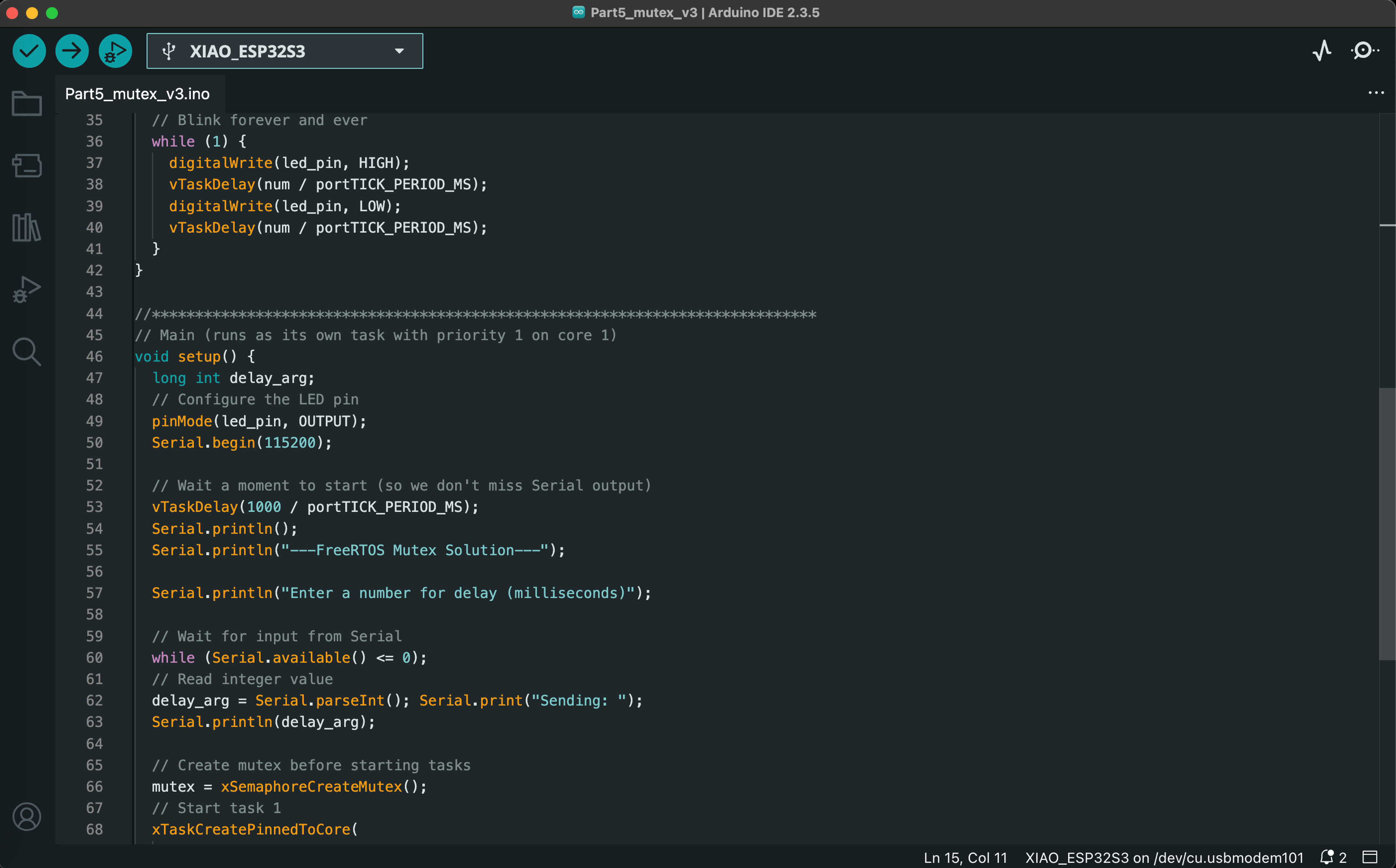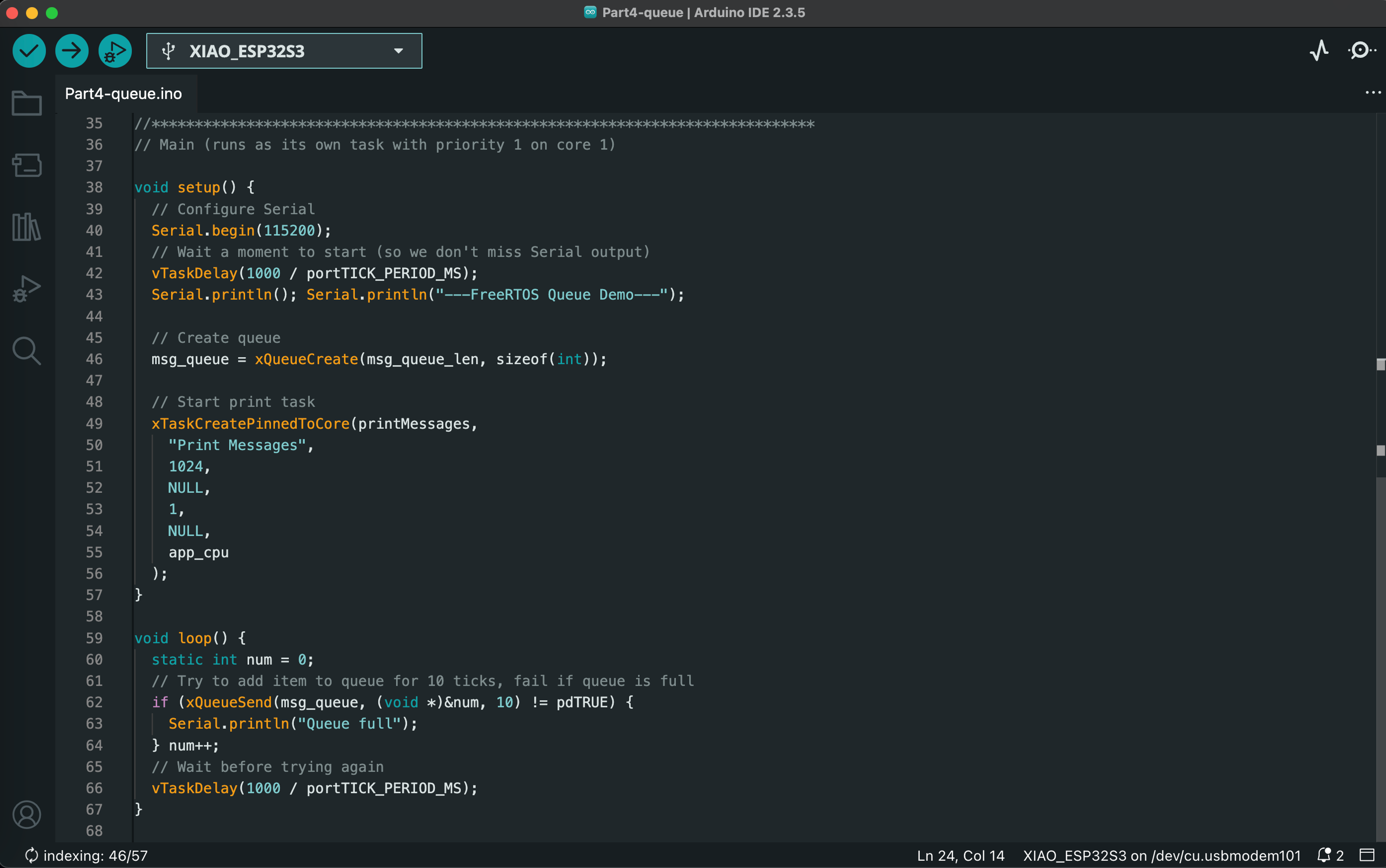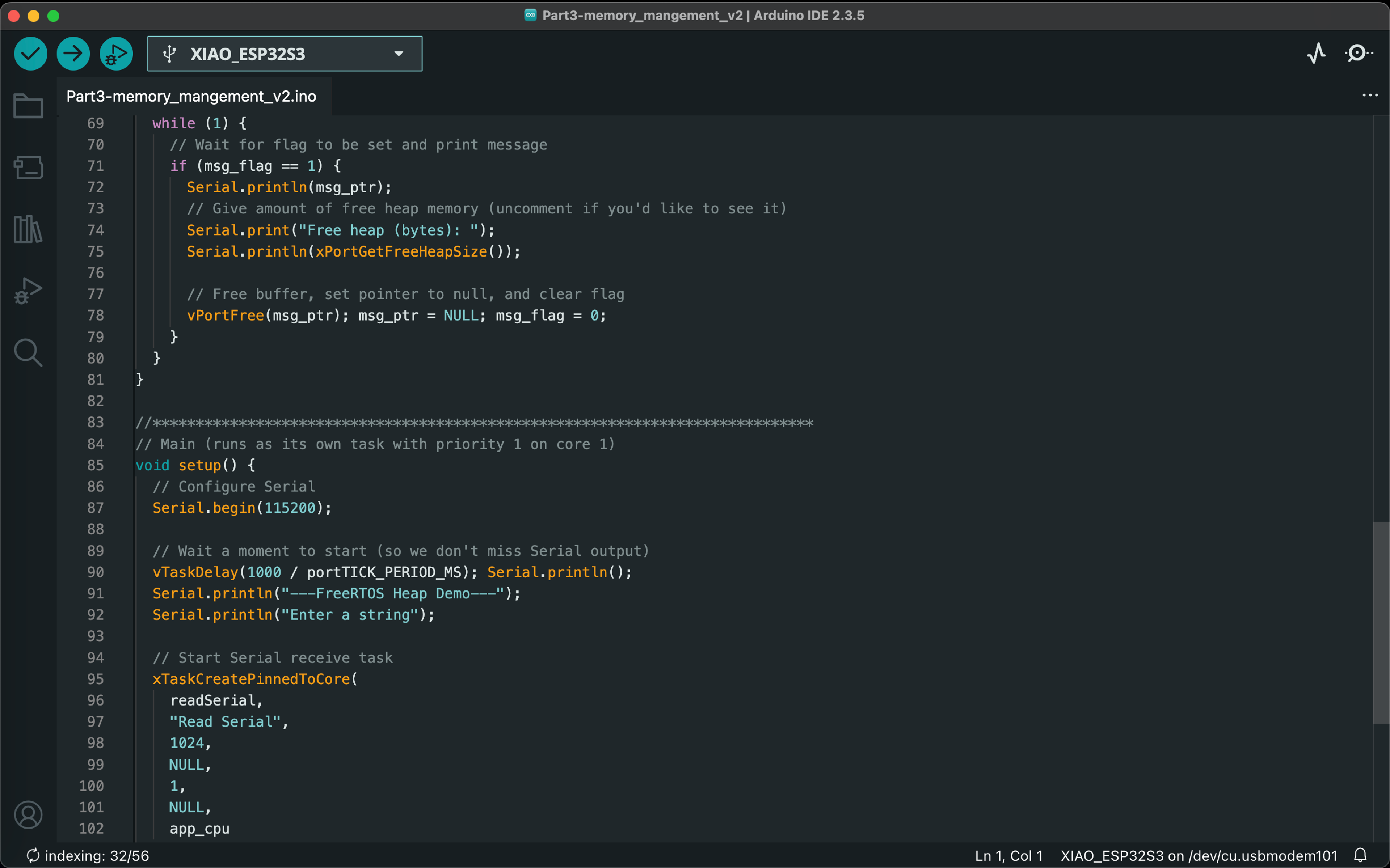 The final lab of the Spring 2025 semester introduced us to real-time operating systems (RTOS) for embedded systems. We ran a series of Arduino sketches on the ESP32S3 that demonstrate essential RTOS capabilities, such as task scheduling, memory allocation, queuing, and multicore operations. The video below demonstrates the functionality of all 7 exercises, and code screenshots for each exercise can be found after the video.