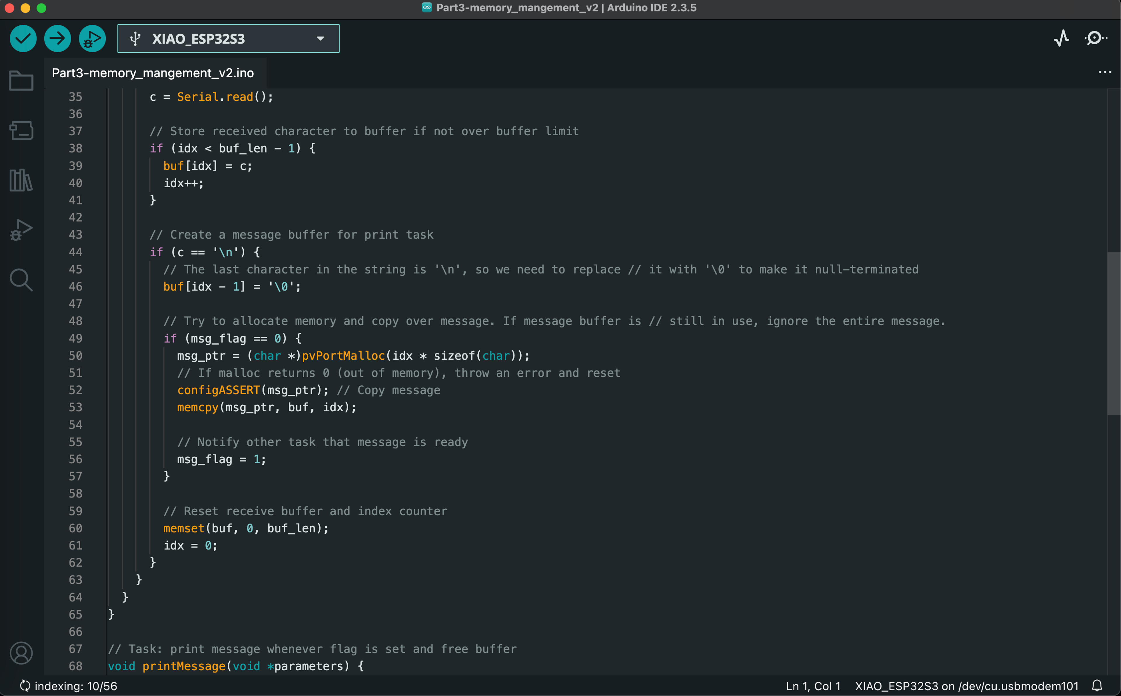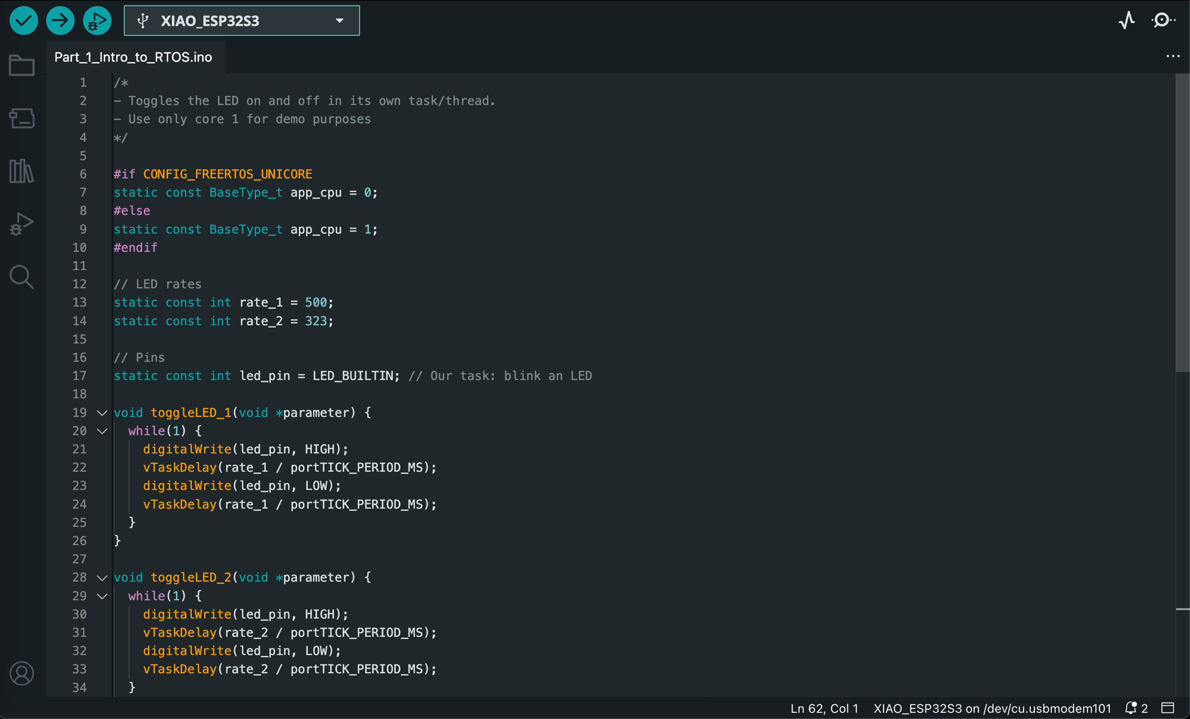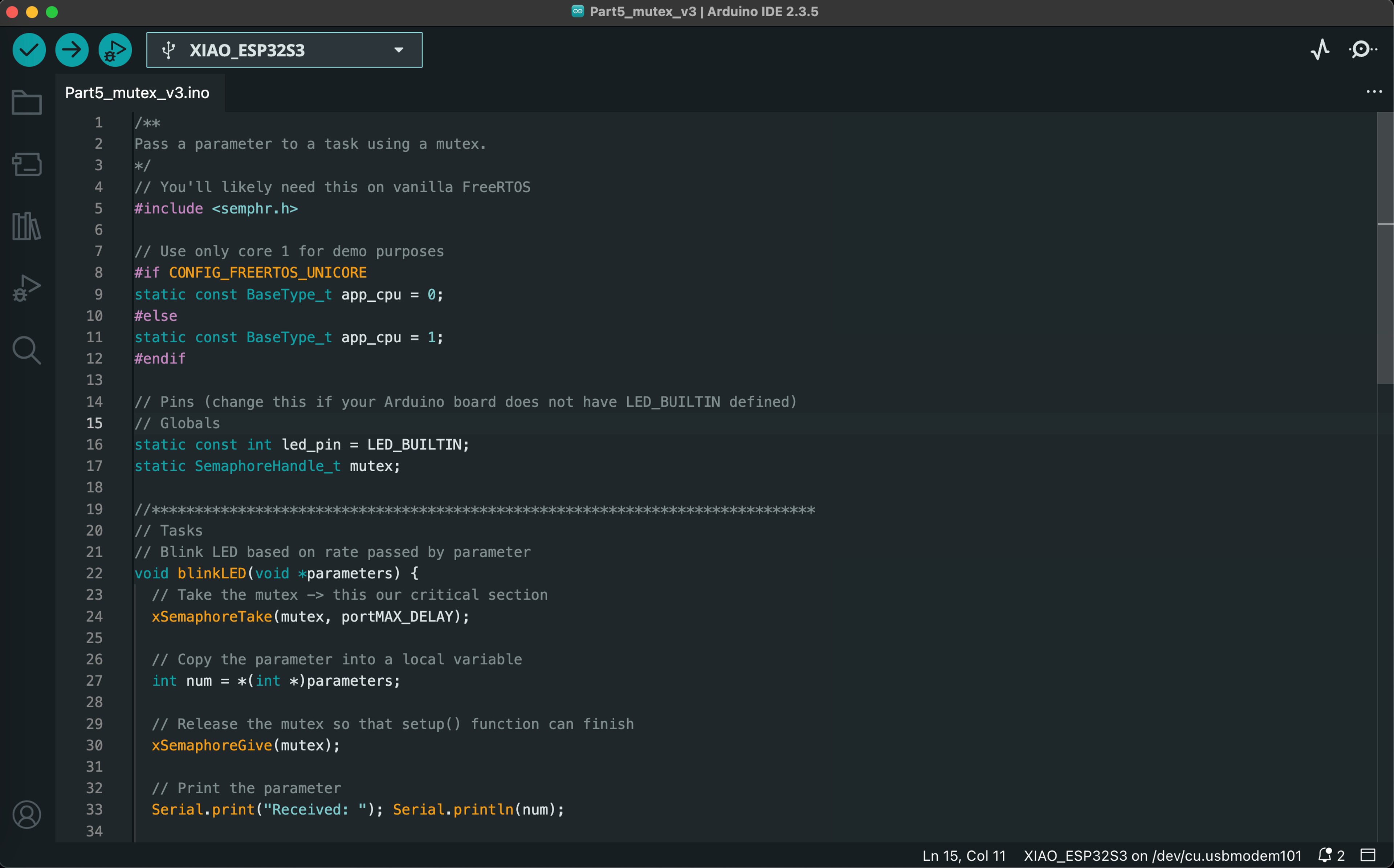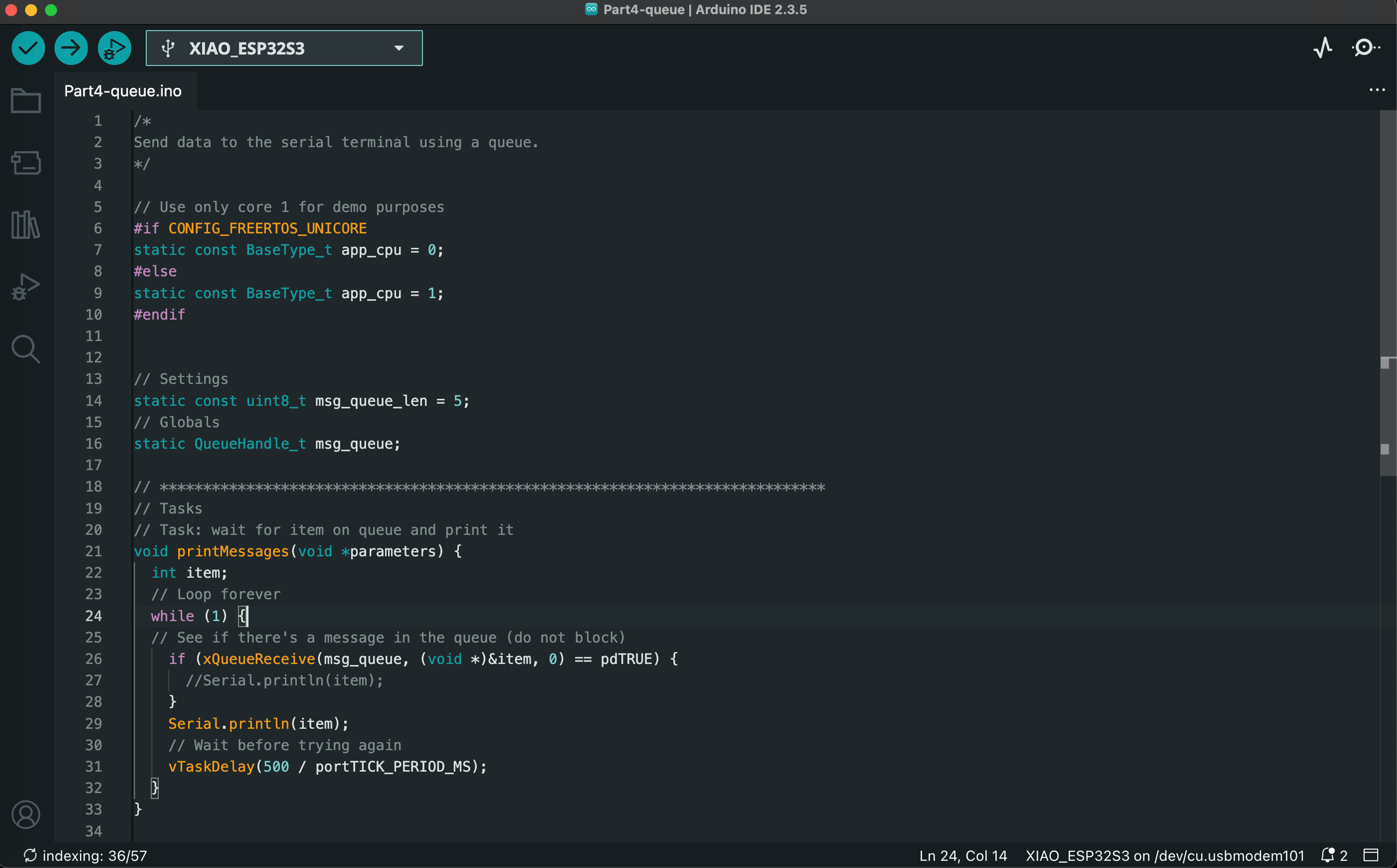 The final lab of the Spring 2025 semester introduced us to real-time operating systems (RTOS) for embedded systems. We ran a series of Arduino sketches on the ESP32S3 that demonstrate essential RTOS capabilities, such as task scheduling, memory allocation, queuing, and multicore operations. The video below demonstrates the functionality of all 7 exercises, and code screenshots for each exercise can be found after the video.