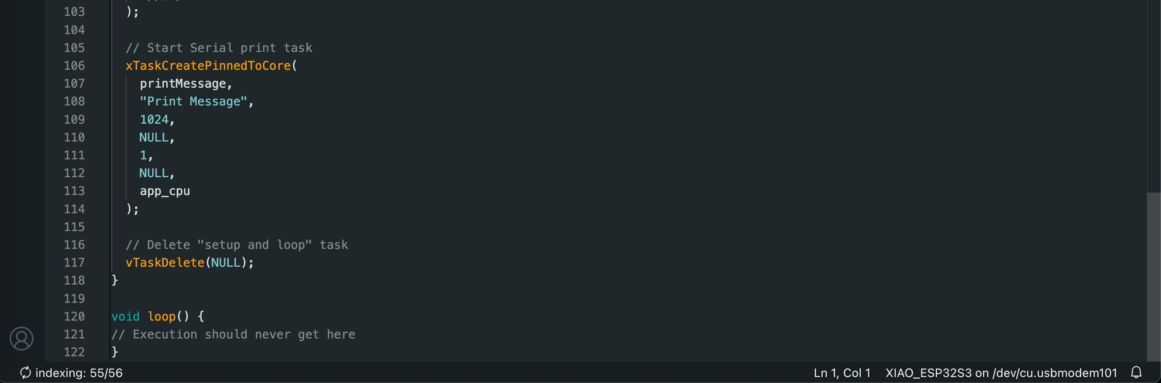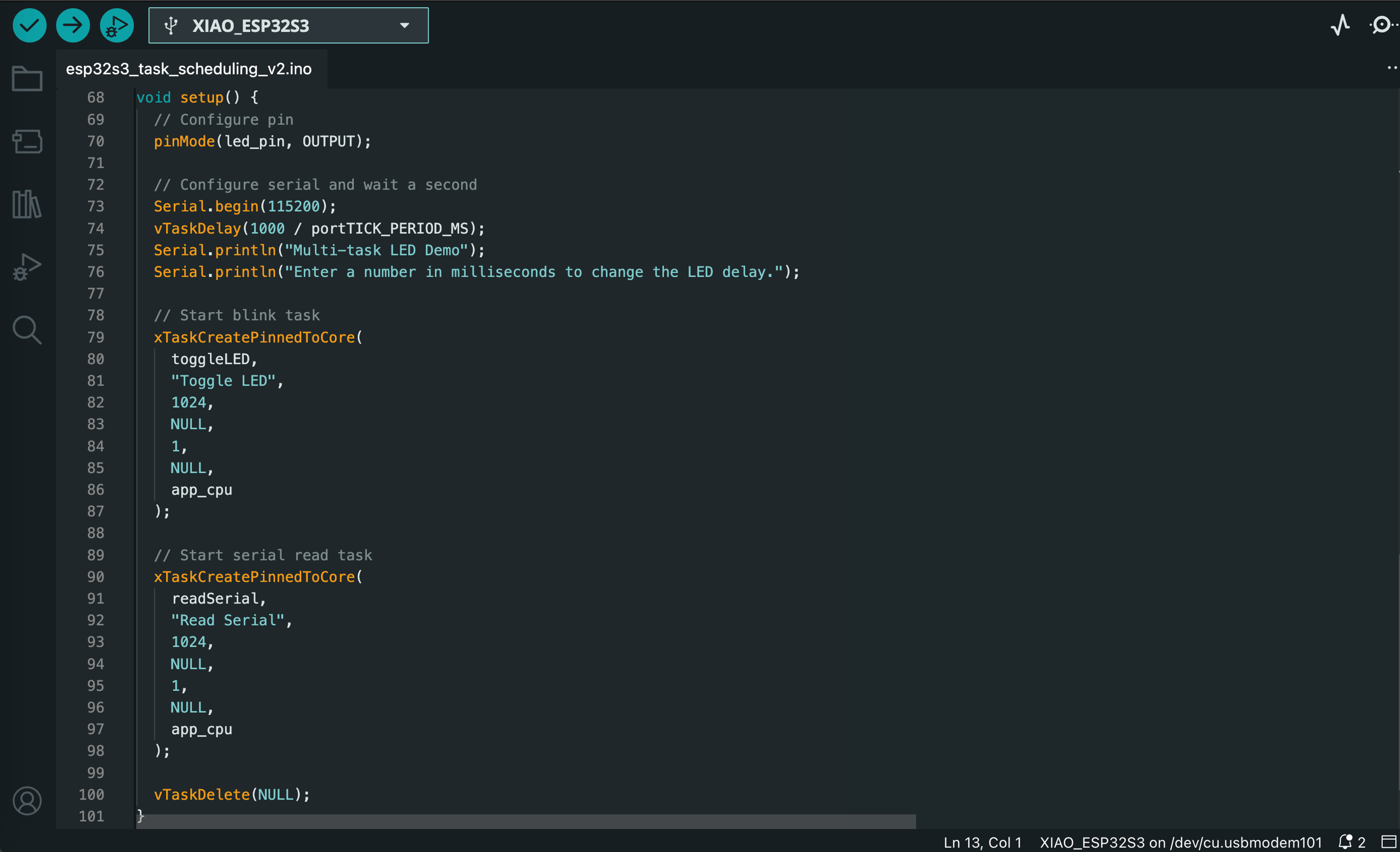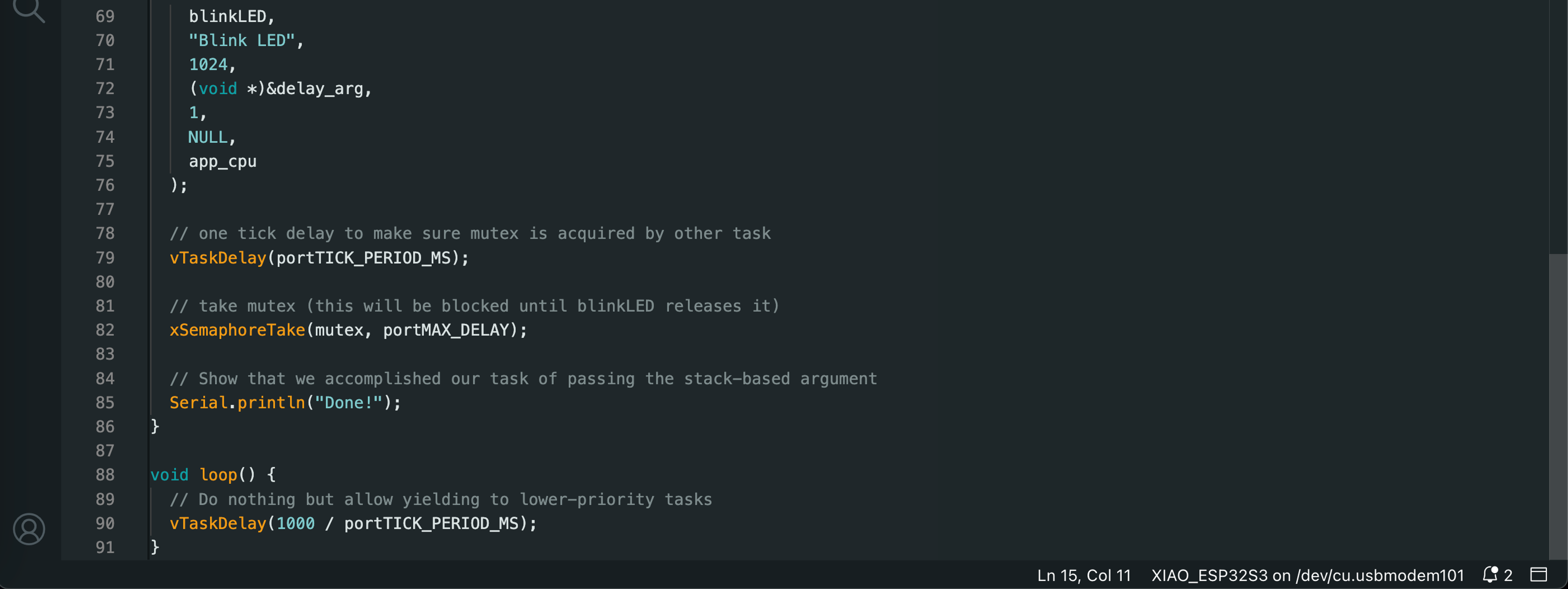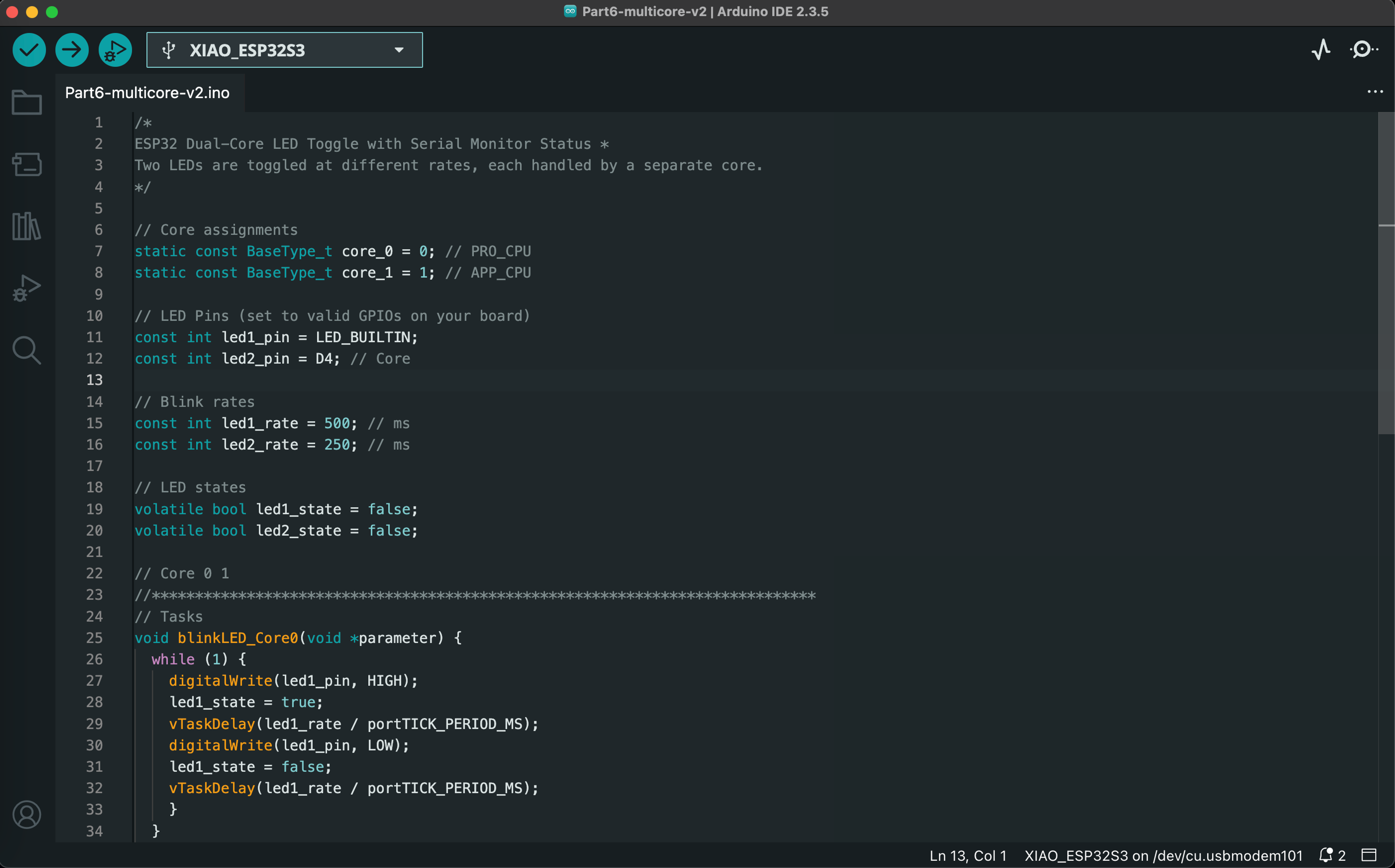 The final lab of the Spring 2025 semester introduced us to real-time operating systems (RTOS) for embedded systems. We ran a series of Arduino sketches on the ESP32S3 that demonstrate essential RTOS capabilities, such as task scheduling, memory allocation, queuing, and multicore operations. The video below demonstrates the functionality of all 7 exercises, and code screenshots for each exercise can be found after the video.